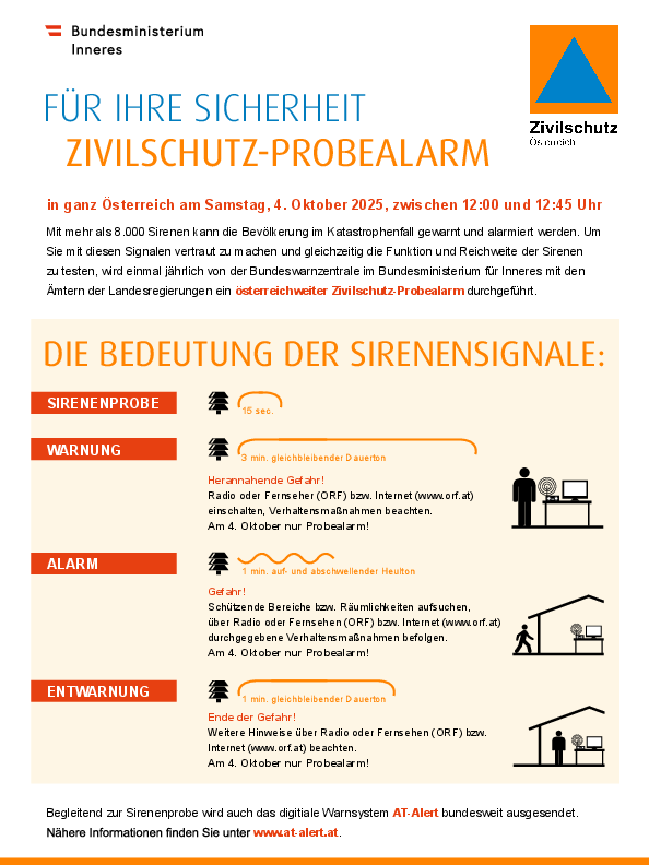 Mit mehr als 8.000 Sirenen kann die Bevölkerung im Katastrophenfall gewarnt und alarmiert werden. Um Sie mit diesen Signalen vertraut zu machen und gleichzeitig die Funktion und Reichweite der Sirenen zu testen, wird einmal jährlich von der Bundeswarnzentrale im Bundesministerium für Inneres mit den Ämtern der Landesregierungen ein österreichweiter Zivilschutz-Probealarm durchgeführt.